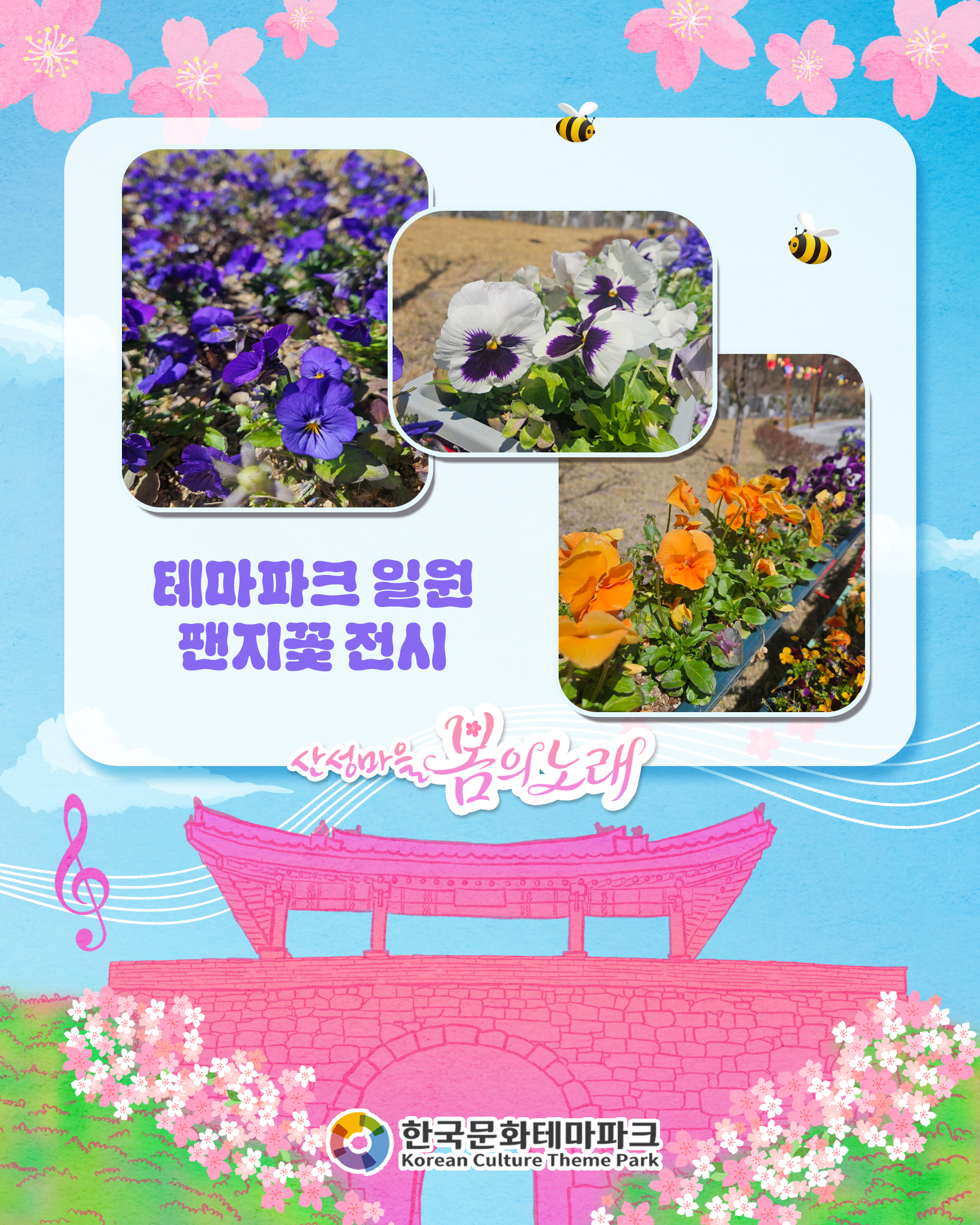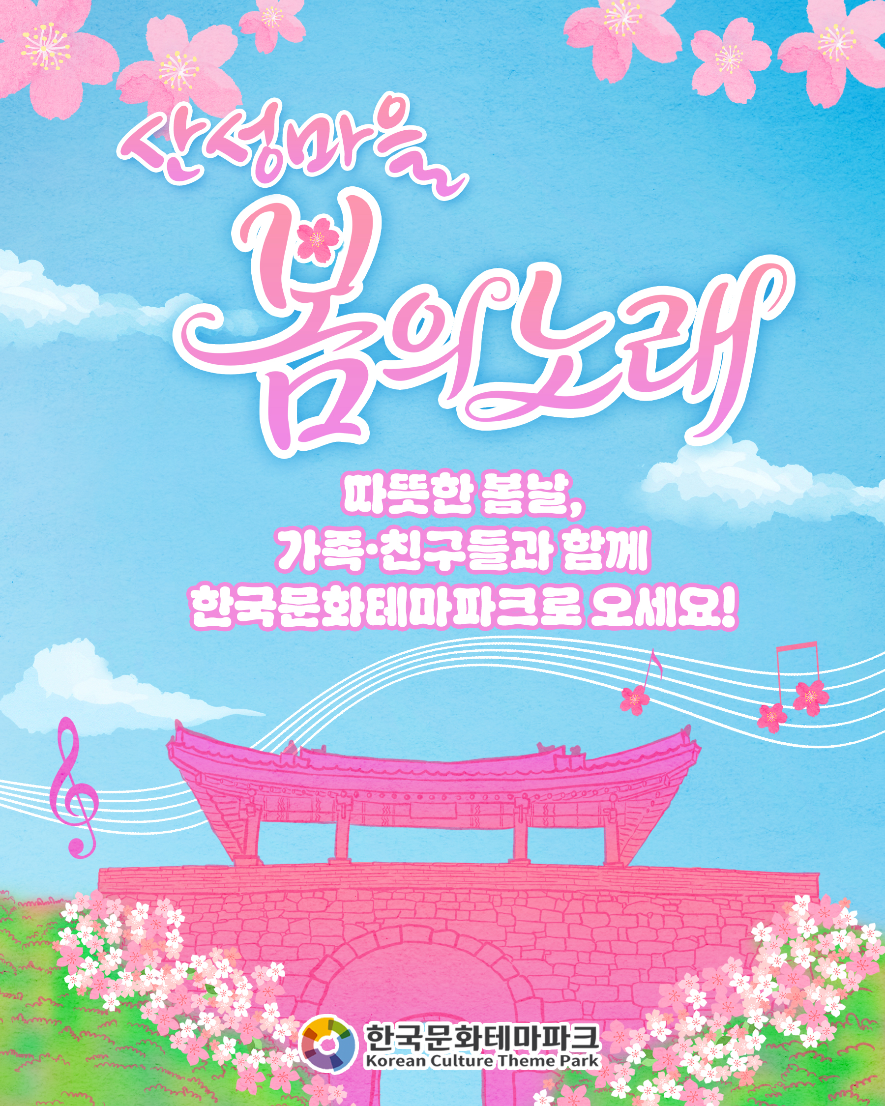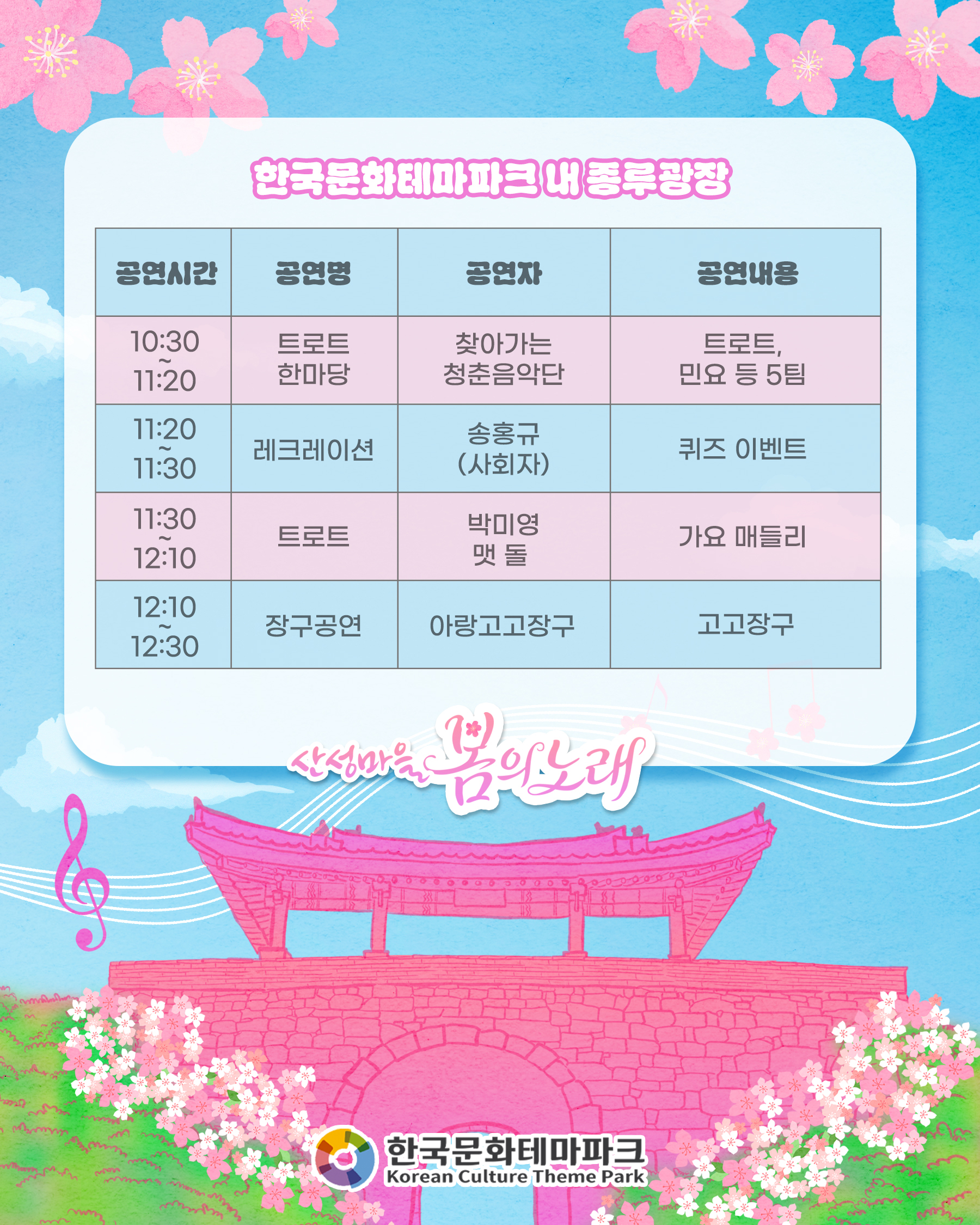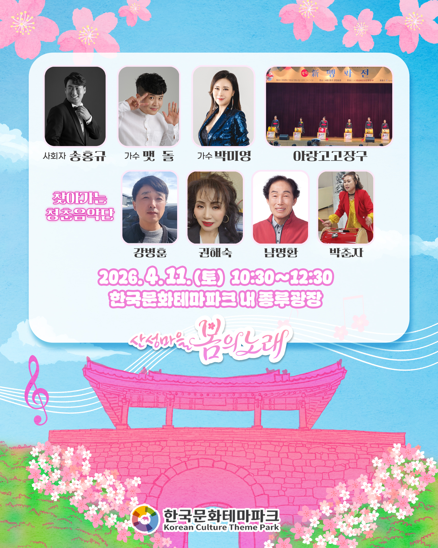 [공연안내] 🎼산성마을 봄의노래🎵🎶 일시: 2026. 4. 11. (토) 10:30~12:30 출연자: 맷돌, 박미영, 아랑고고장구, 찾아가는 청춘음악단 사회자: 송홍규 장소: 한국문화테마파크 내 종루광장 봄날의 노래를 좋아하나요? 흥겨운 날씨, 화창한 공연 보러오세요~